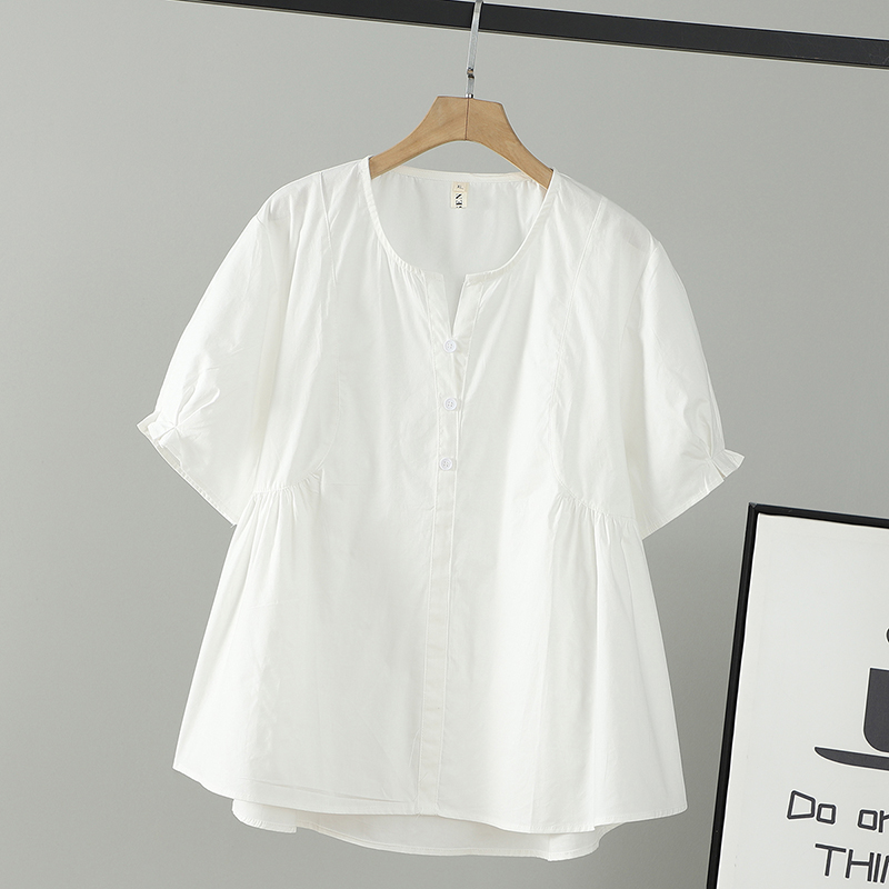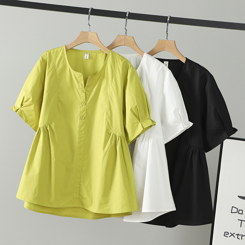 胖mm夏装T恤女显瘦时髦大码上衣藏肉小V领200斤灯笼袖甜辣娃娃衫