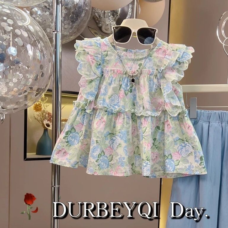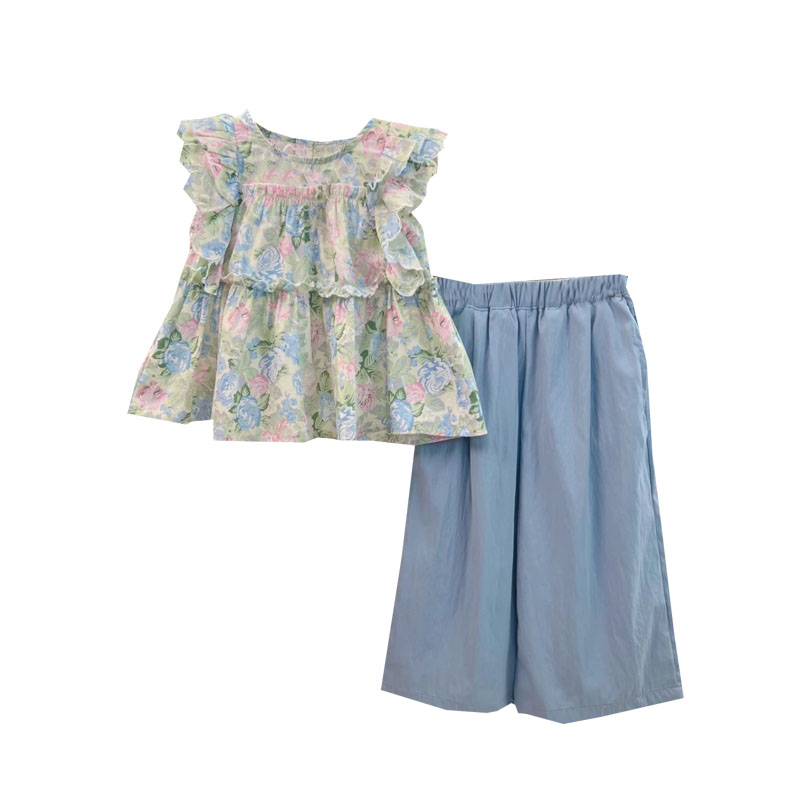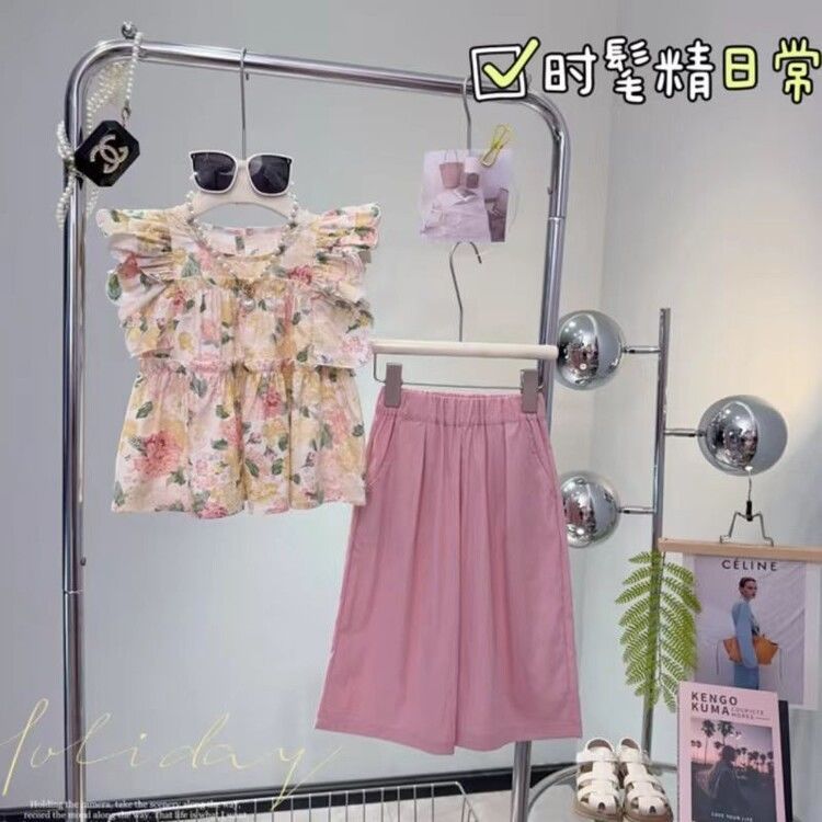 女童套装夏季2025新款碎花阔腿裤儿童夏装宝宝洋气时髦短袖两件套