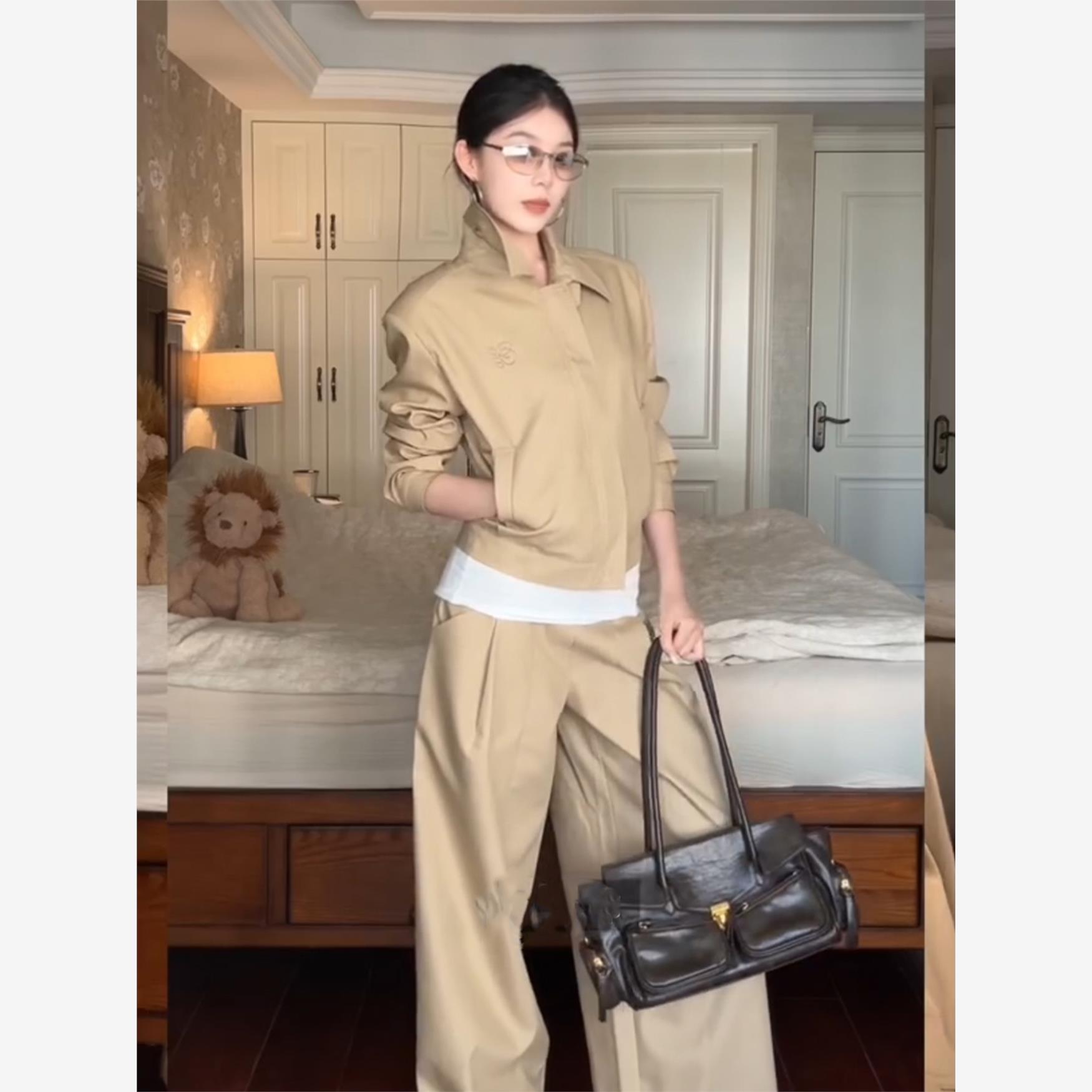 卡其色夹克短款外套女2025新款秋季一整套ootd穿搭套装韩系休闲裤