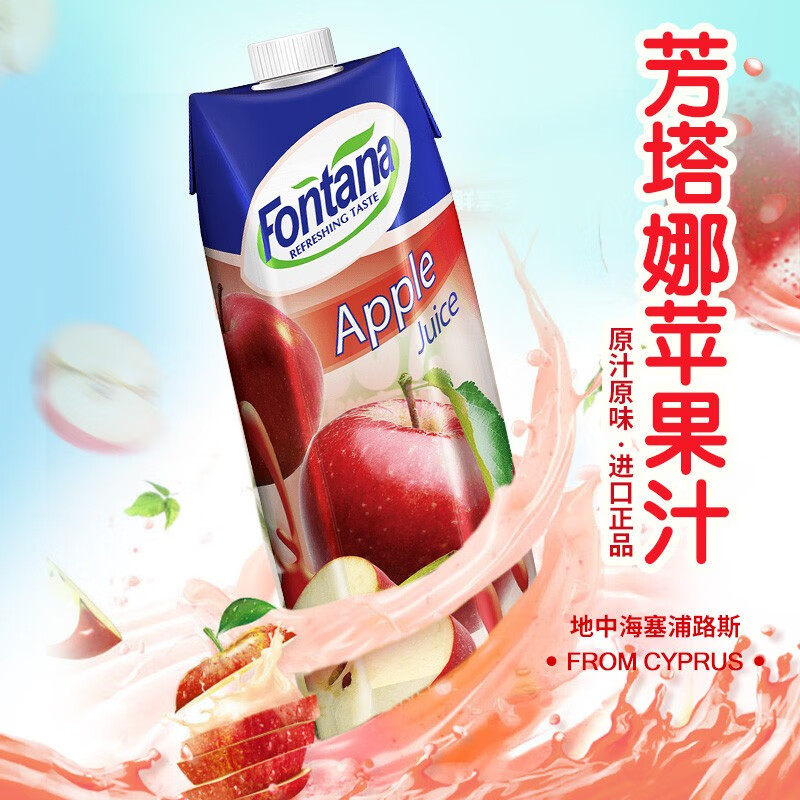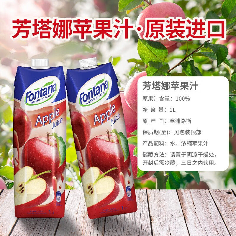 塞浦路斯进口fontana芳塔娜100%苹果汁无添加1L*2轻食果蔬汁饮料