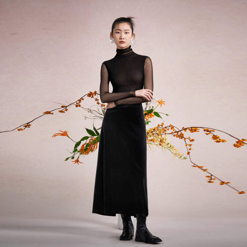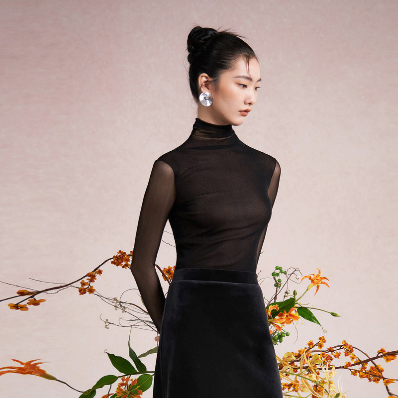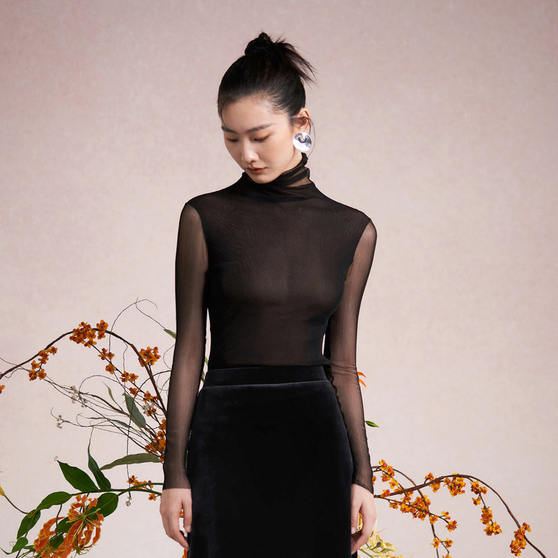 [专柜同款]Yifini/易菲100%桑蚕丝网纱打底修身长袖时尚针织衫女