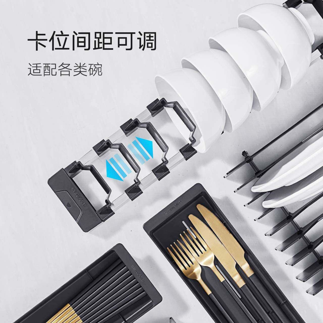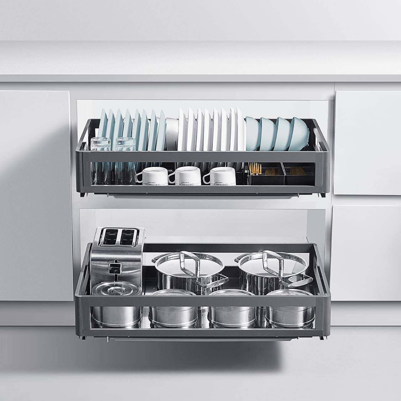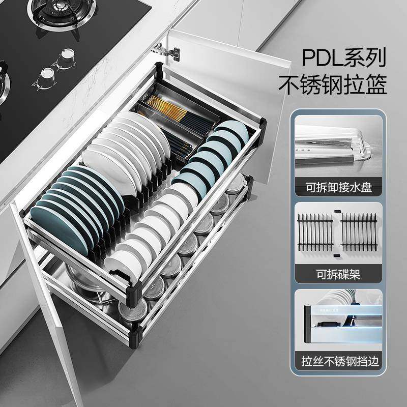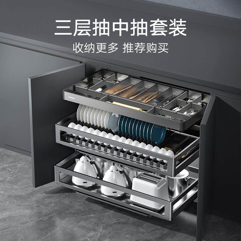 悍高橱柜拉篮双层开门式抽屉式内置碗架304不锈钢厨房收纳碗碟篮
