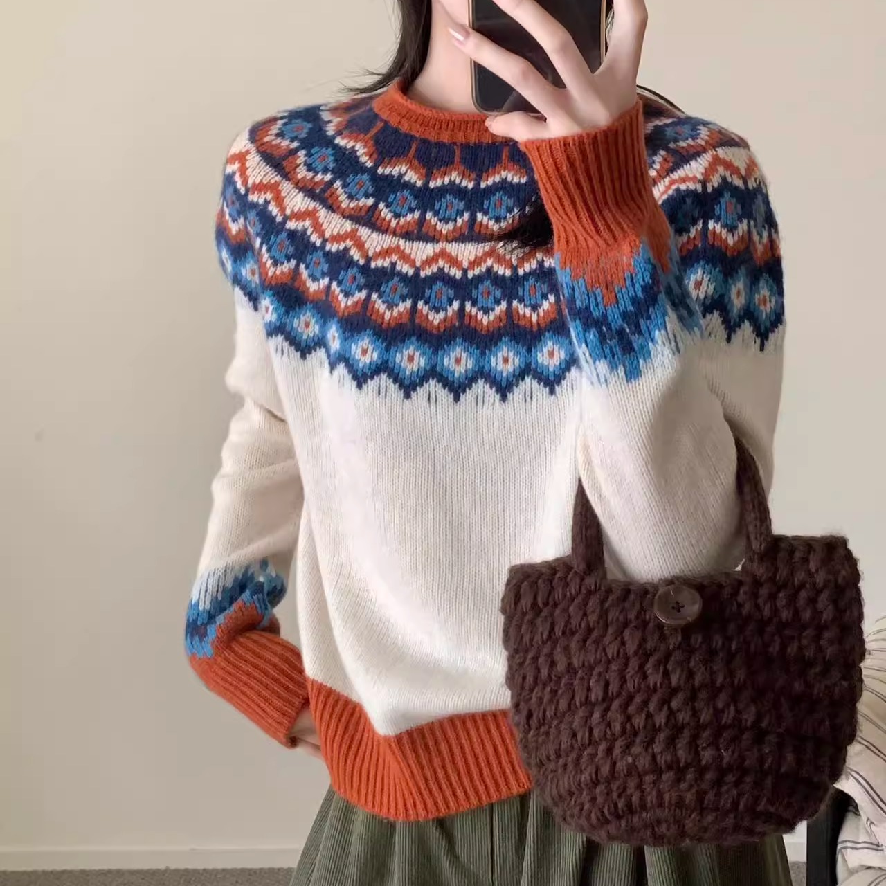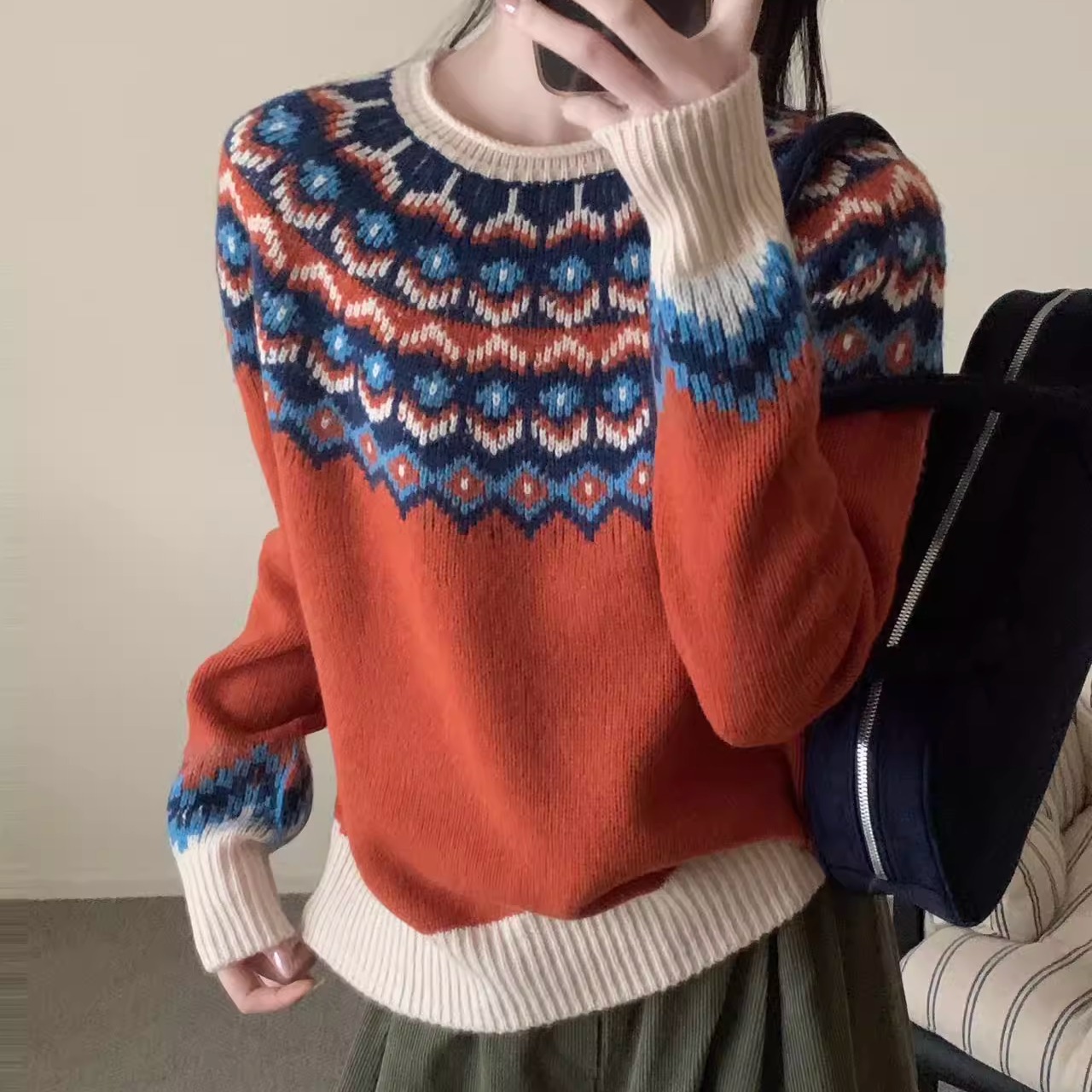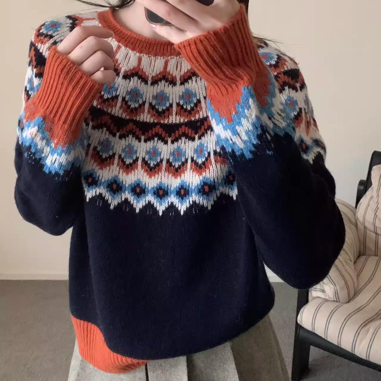 2025秋冬韩系时尚复古条纹提花圆领羊毛针织衫宽松简约软糯打底衫