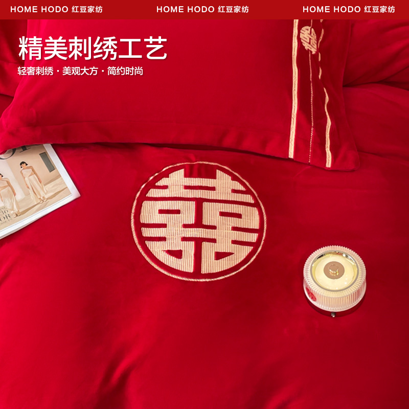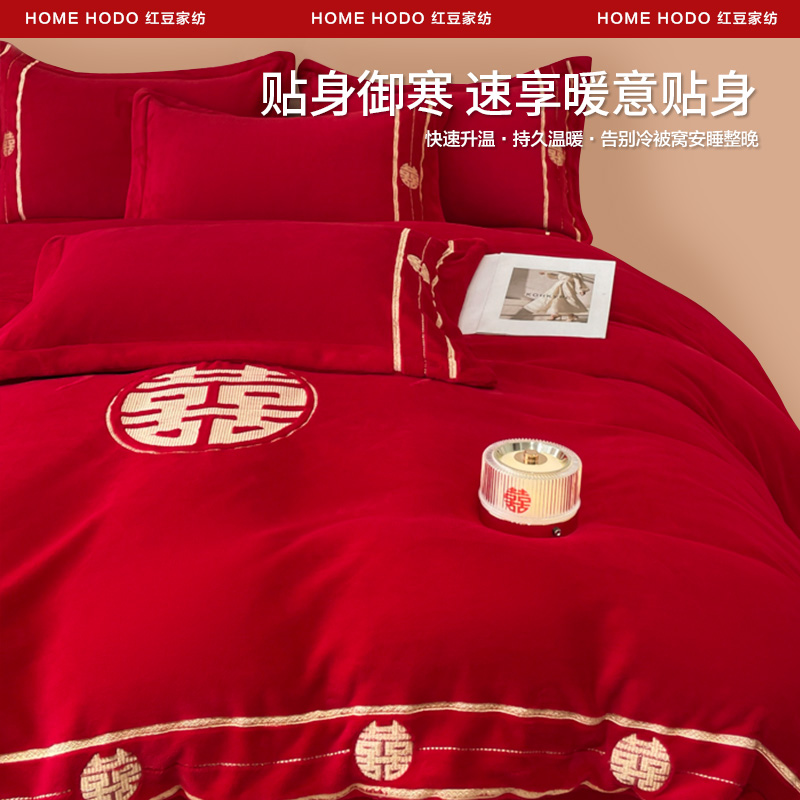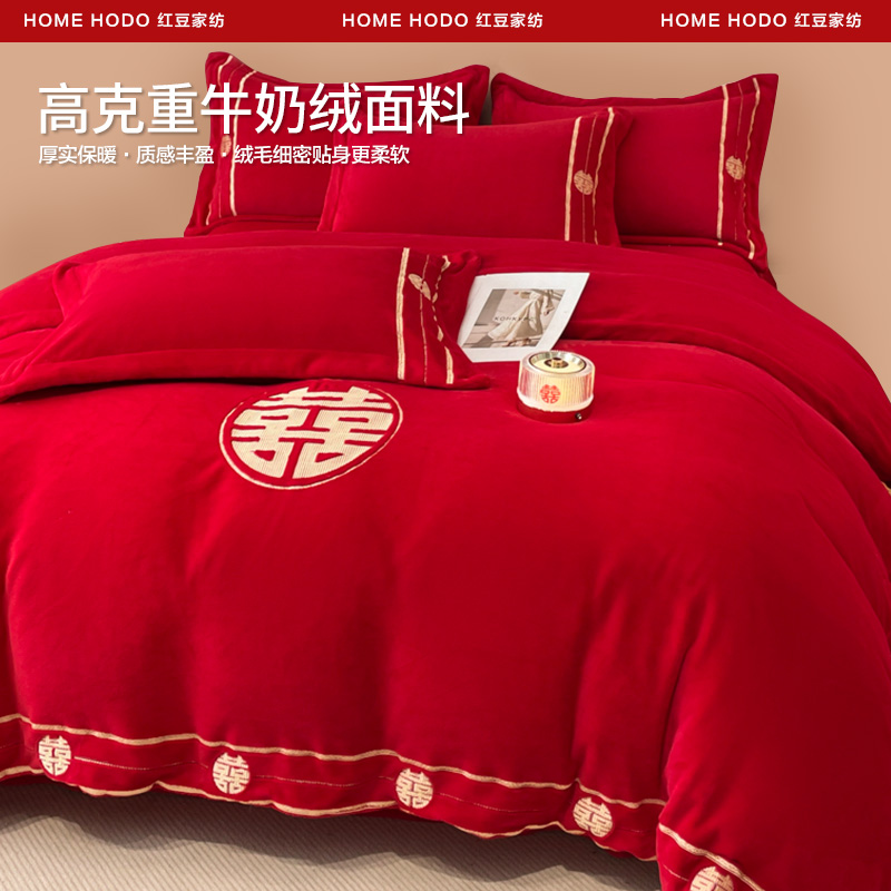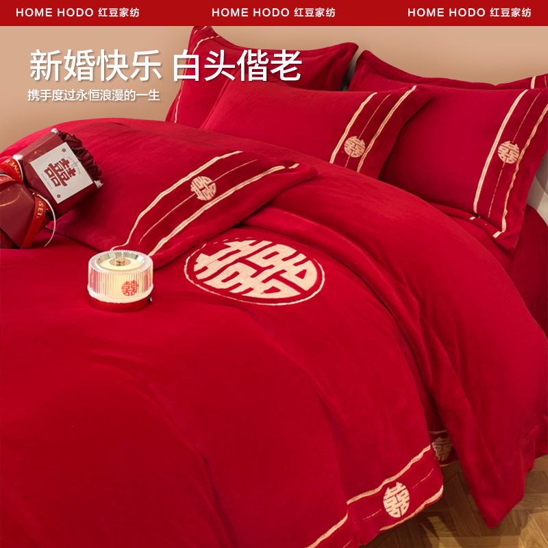 红豆高档牛奶绒四件套冬季珊瑚绒红色婚庆床上用品加厚床单床笠