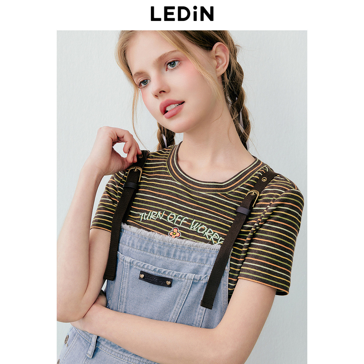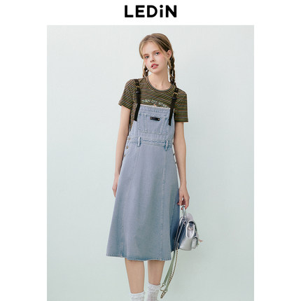 乐町甜美少女风撞色背带牛仔裙夏季新款爱心撞钉舒适牛仔长裙