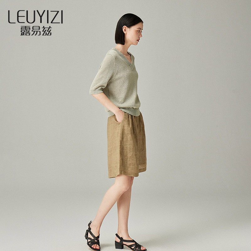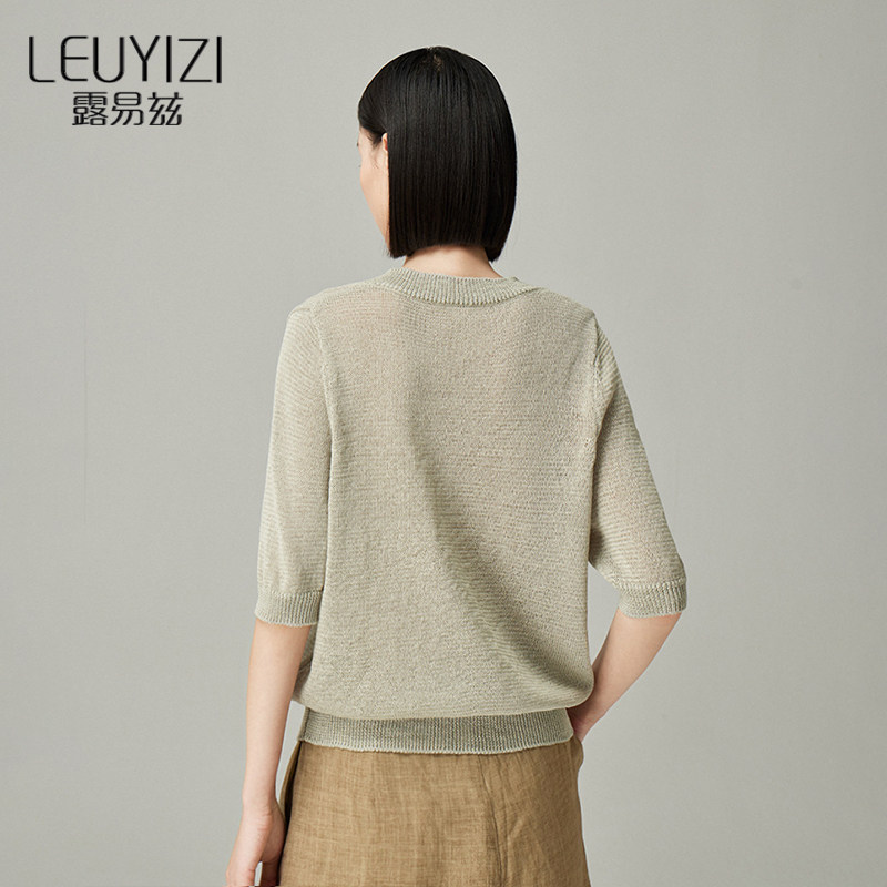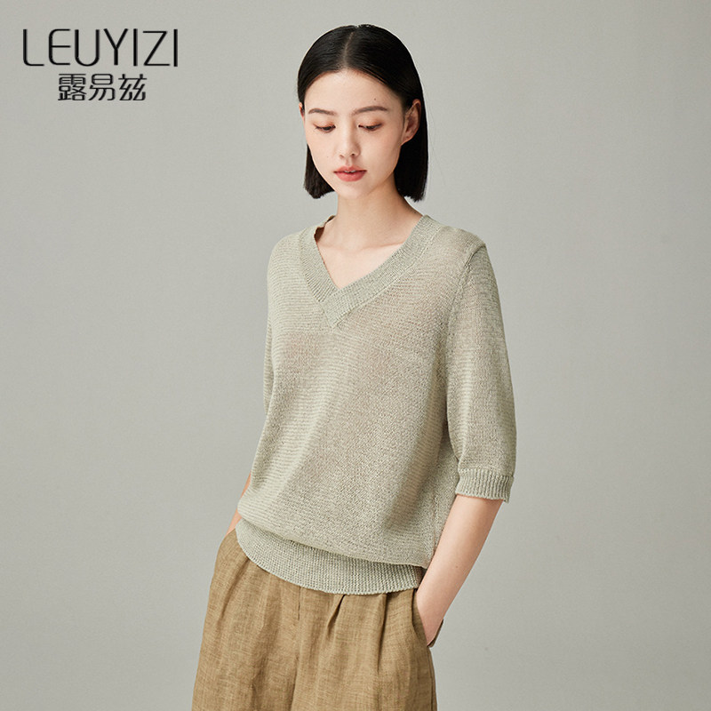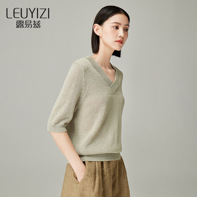V领宽松针织衫女五分袖薄款2024夏微透视套头简约女士针织上衣T恤