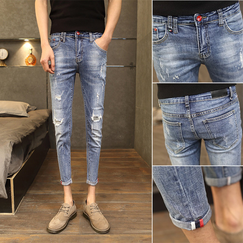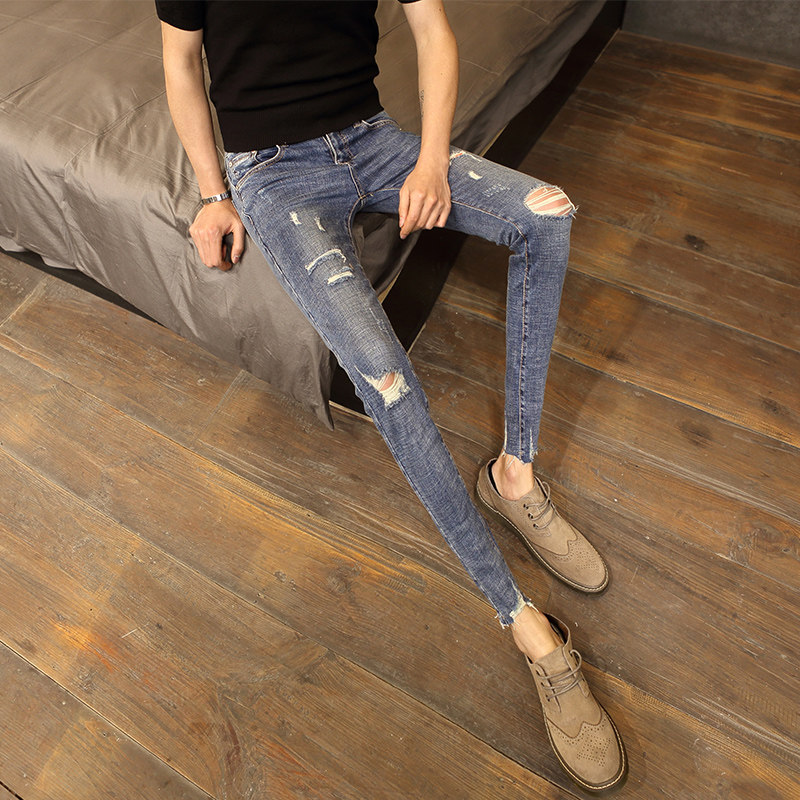 网红破洞牛仔九分裤潮男修身韩版发型师弹力紧身小脚乞丐9分裤子