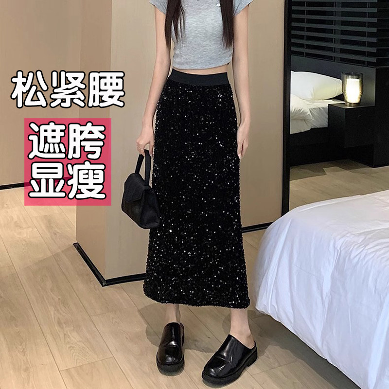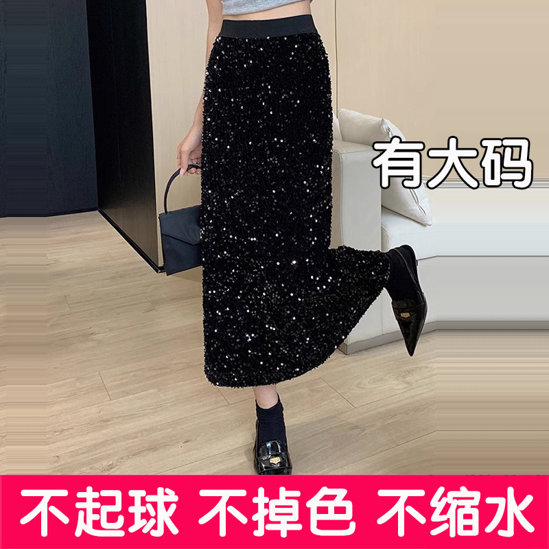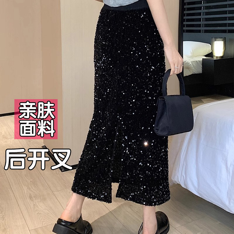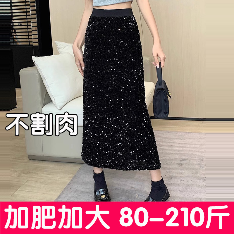 大码亮片半身裙女高腰遮胯包臀裙开叉一步裙丝绒长裙子胖mm春秋冬