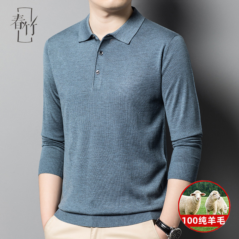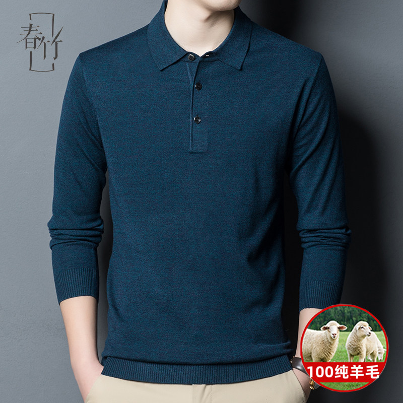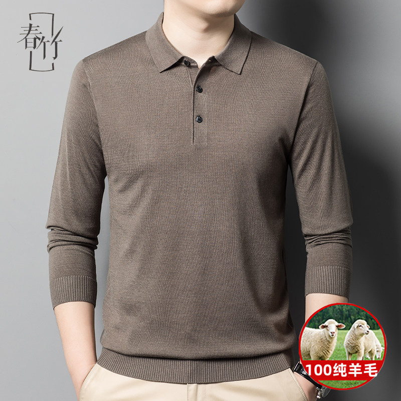 春竹翻领纯羊毛衫男士宽松春秋中老年爸爸羊毛打底薄款休闲毛衣