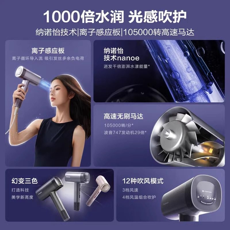 松下纳诺怡电吹风机高速吹风家用大功率低温速干送情人节礼物NW90