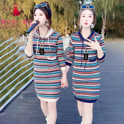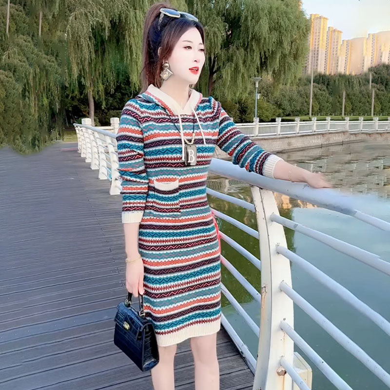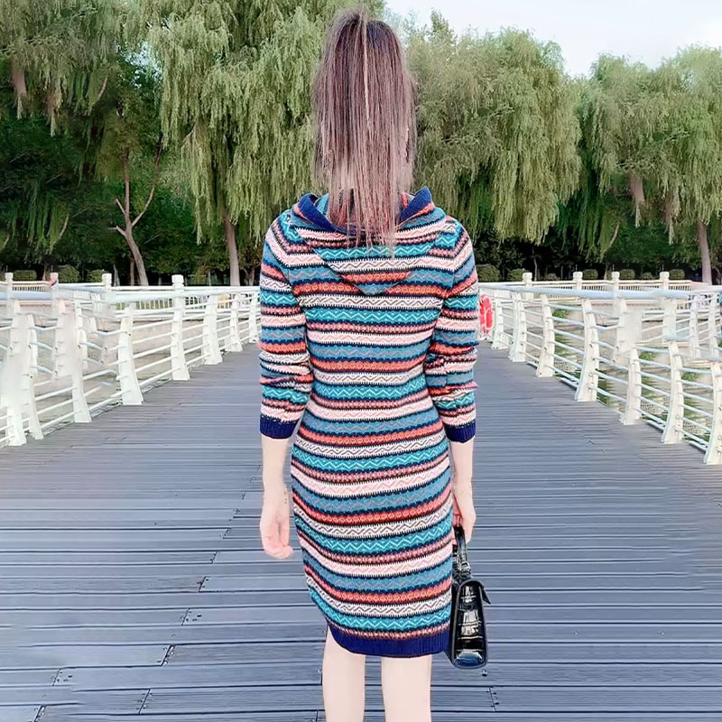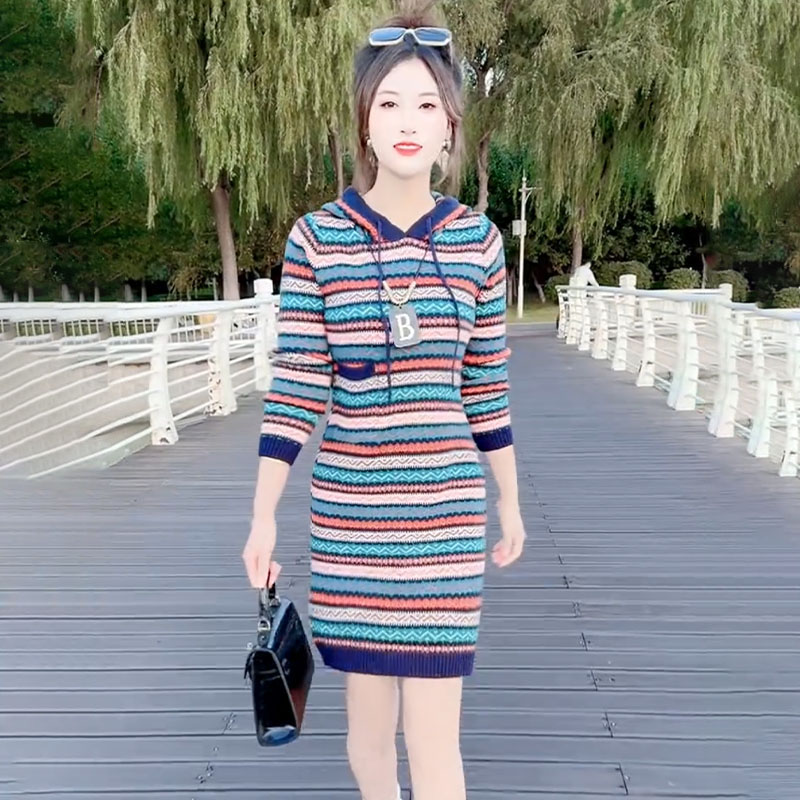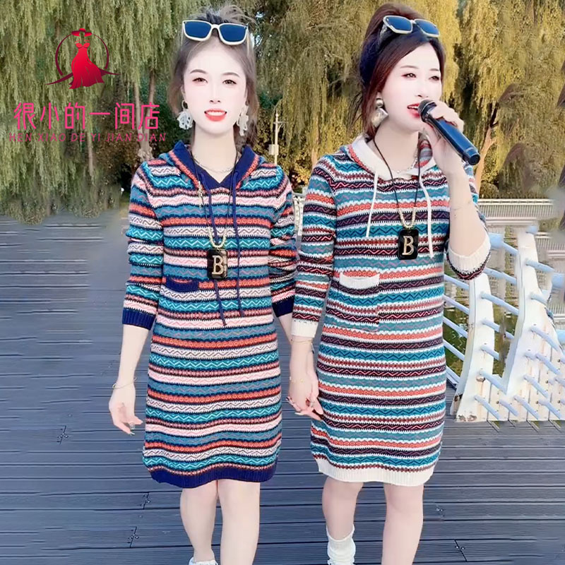时尚潮流复古条纹针织连衣裙女士2025秋冬新款宽松百搭中长款裙子