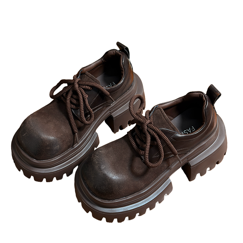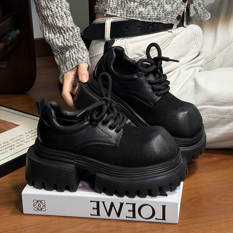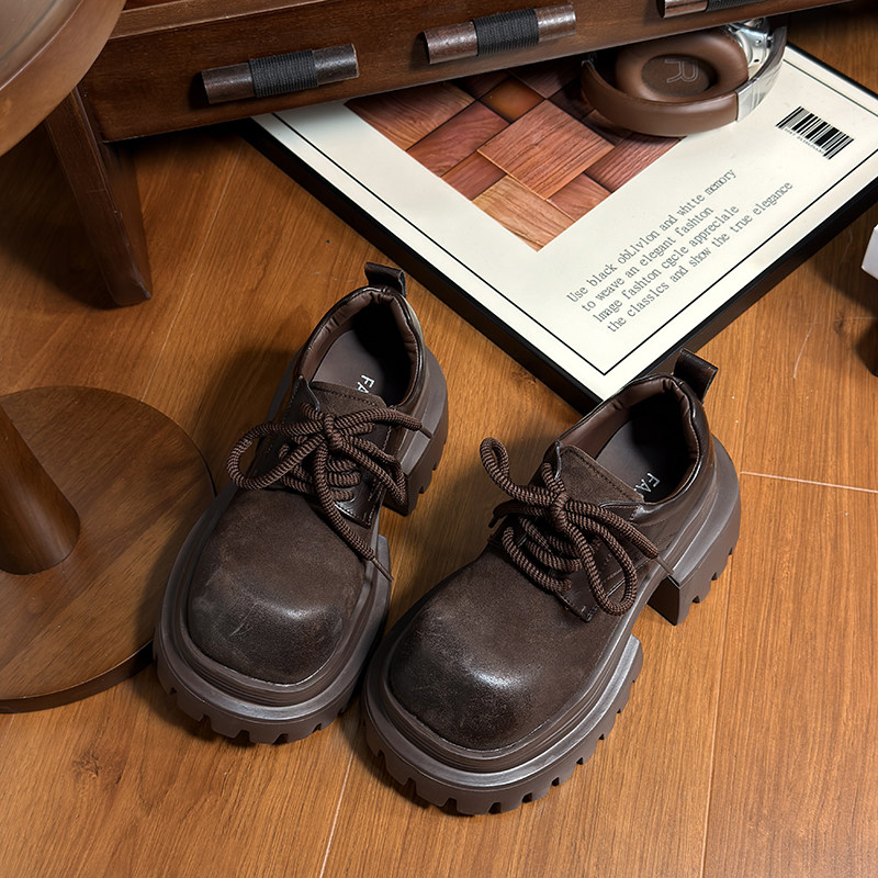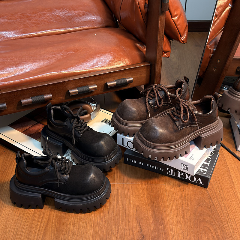 复古真皮松糕厚底小皮鞋女英伦风圆头德比鞋小个子增高加绒乐福鞋