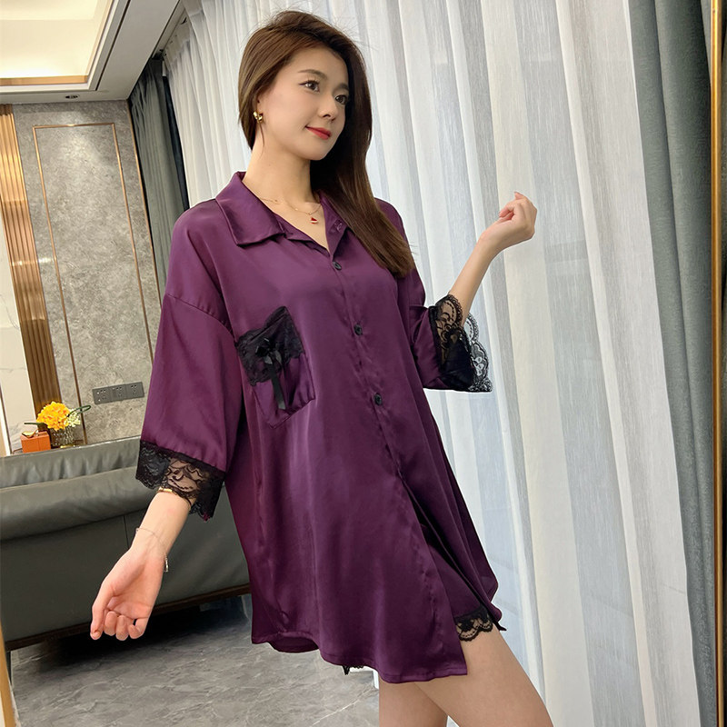 紫色性感冰丝睡衣女夏新款2026高级感蕾丝镂空女士睡裙套装家居服