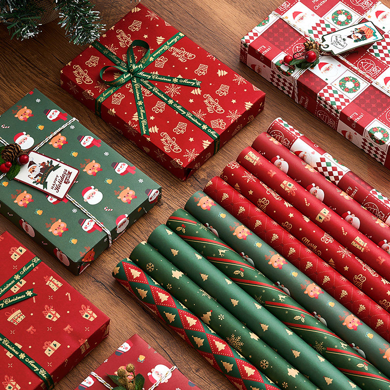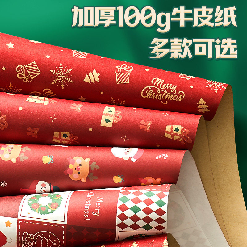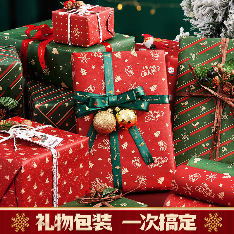 圣诞节礼物包装纸牛皮纸生日礼盒儿童卡通可爱彩纸复古绿红色包书纸大张加丝带打包材料超大尺寸高级感礼品纸