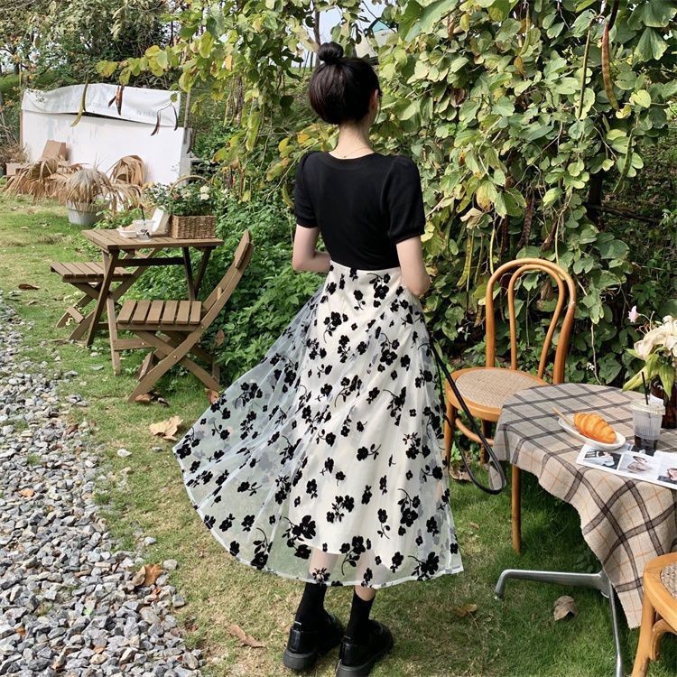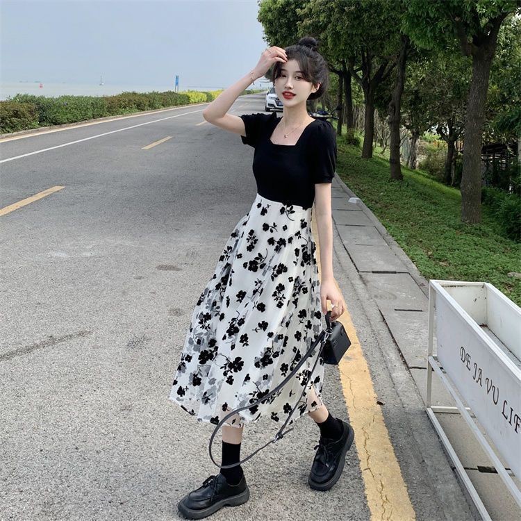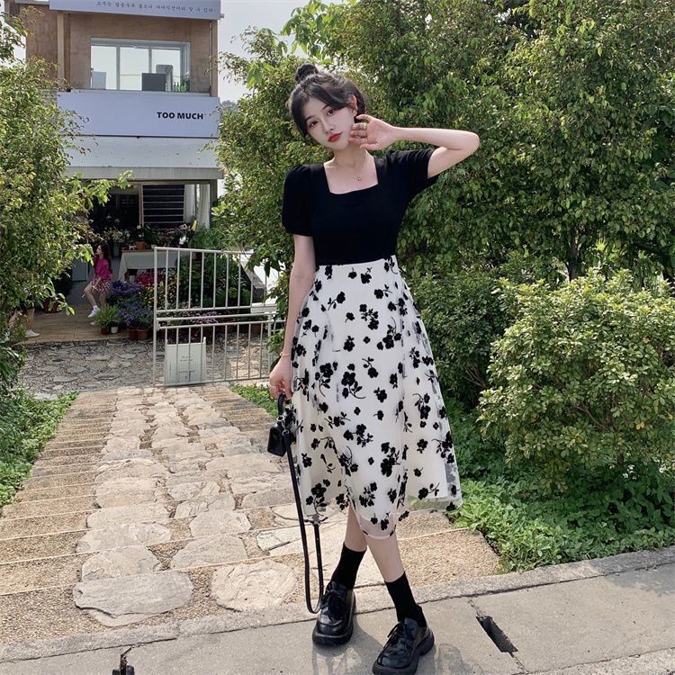 小个子显高假两件连衣裙女150cm法式方领碎花设计感中长裙XS码夏