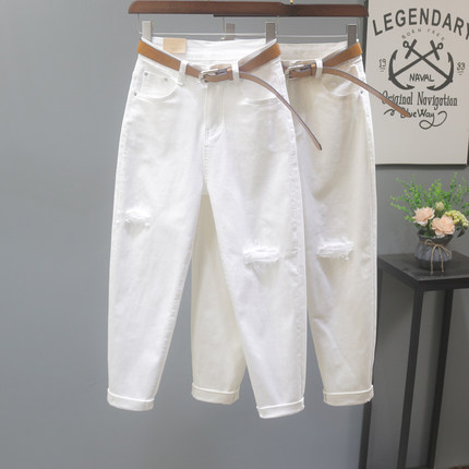 米白色牛仔裤子女2025夏季新款假破洞高腰弹力宽松休闲九分哈伦裤