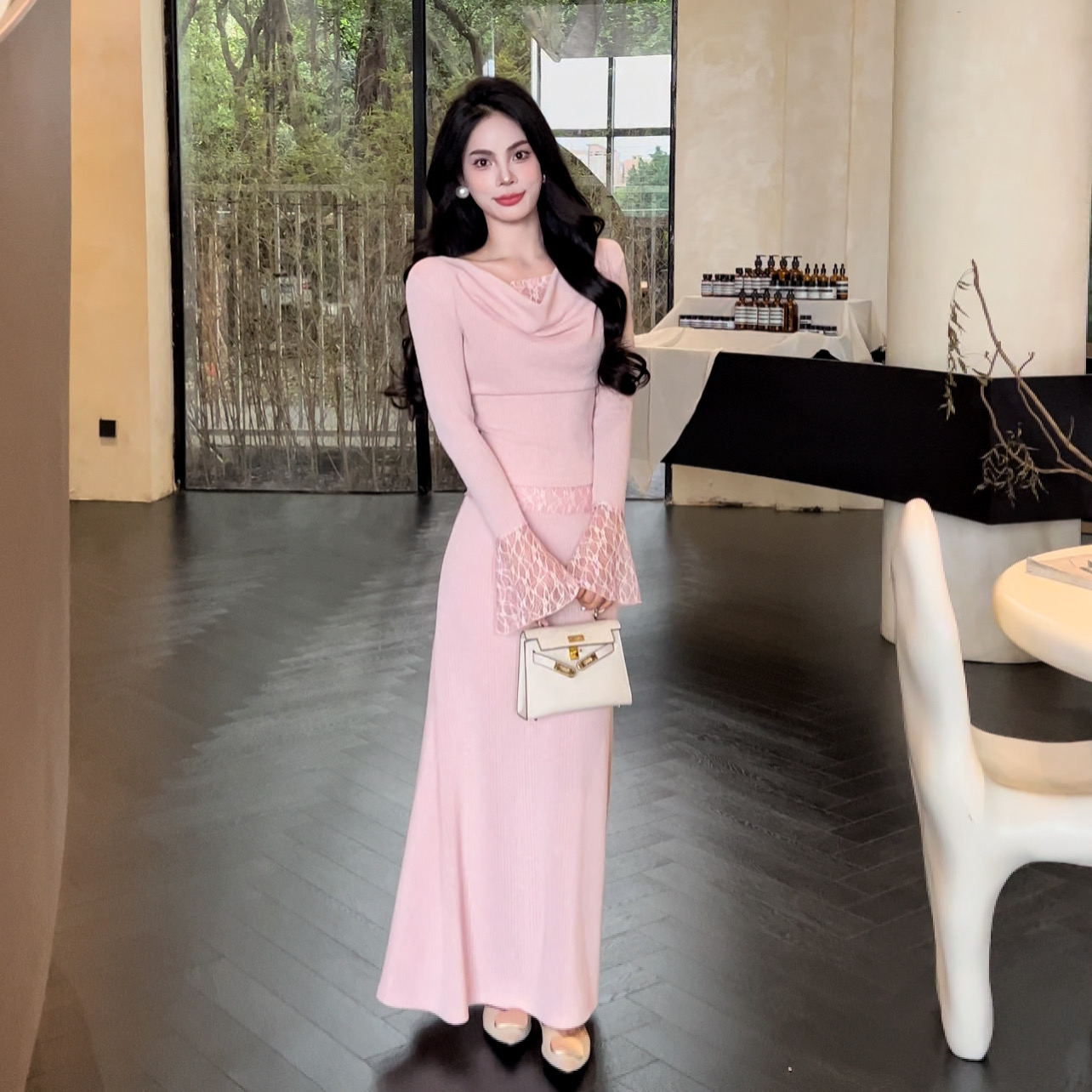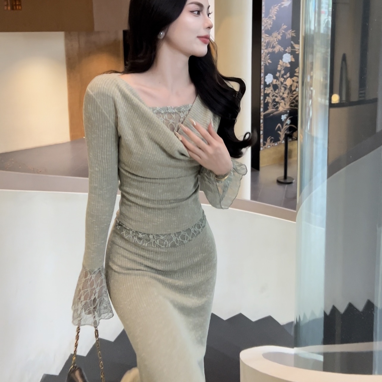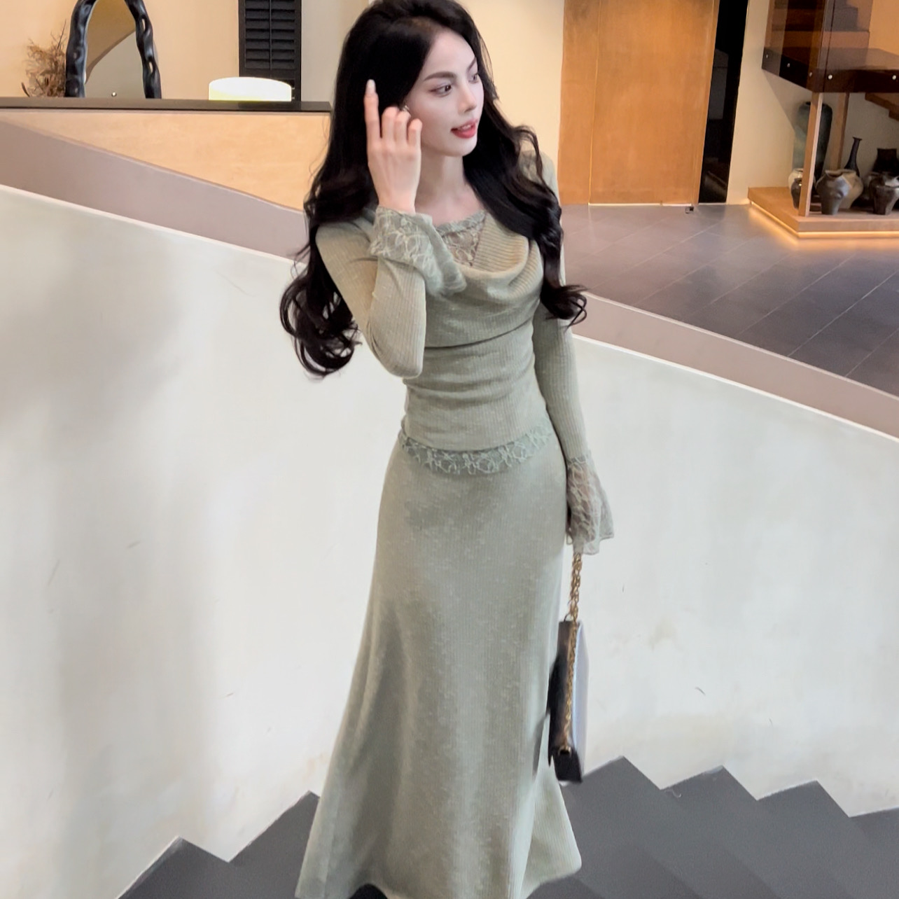 秋冬气质时尚性感长袖法式轻熟风复古拼接蕾丝套装
