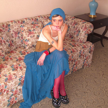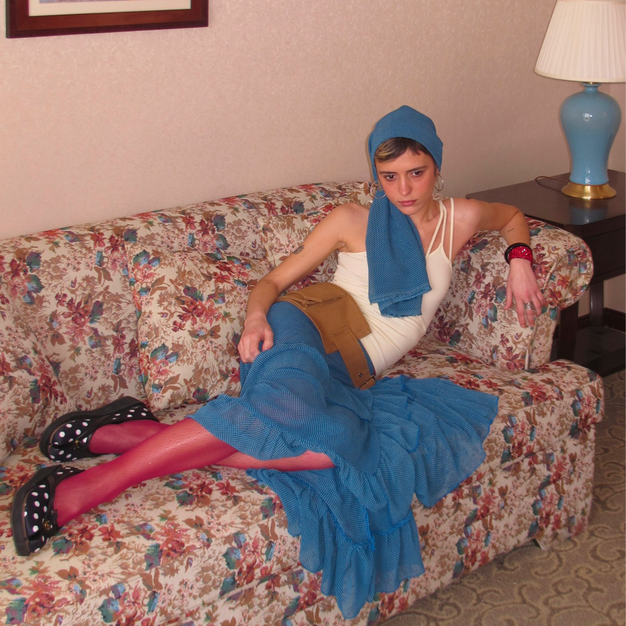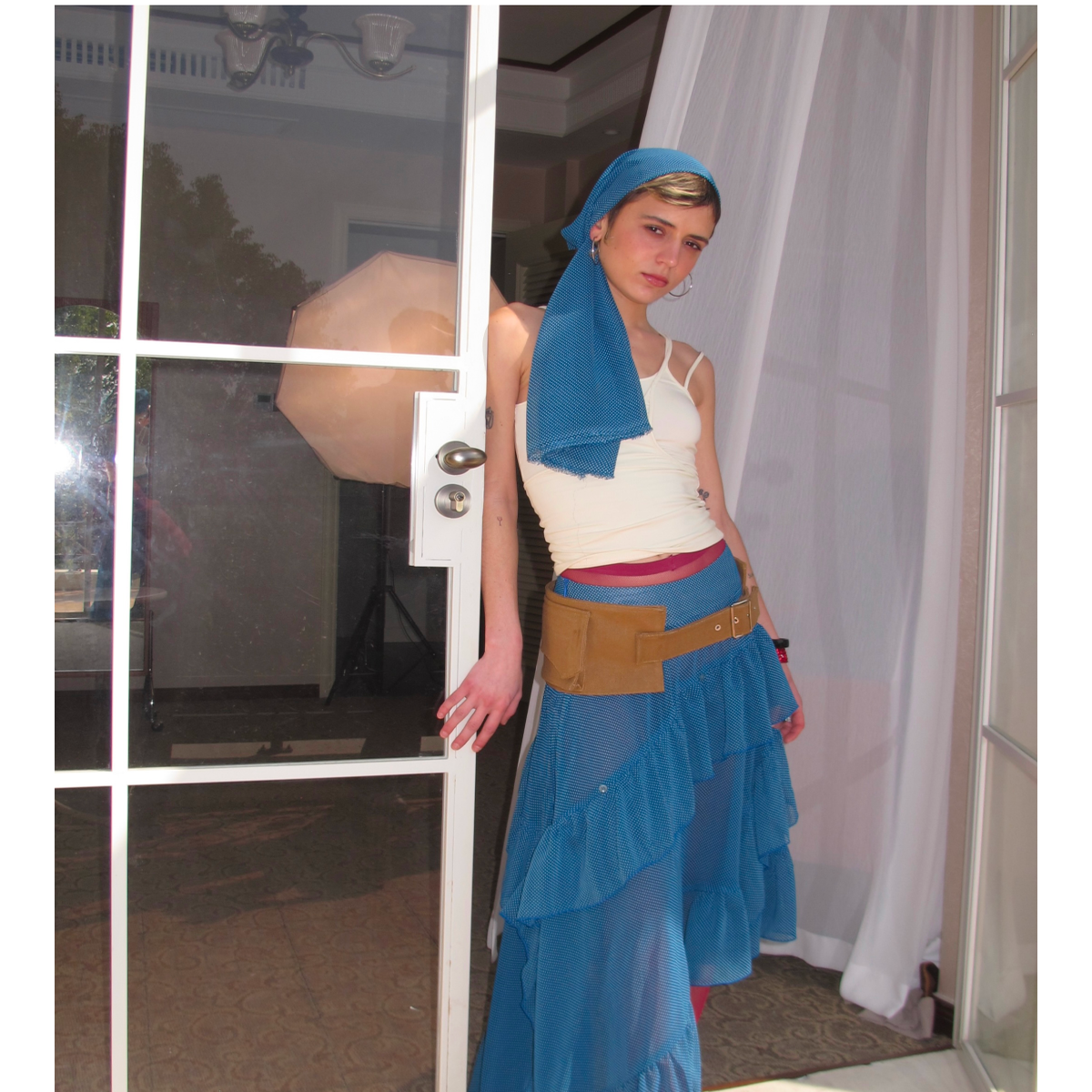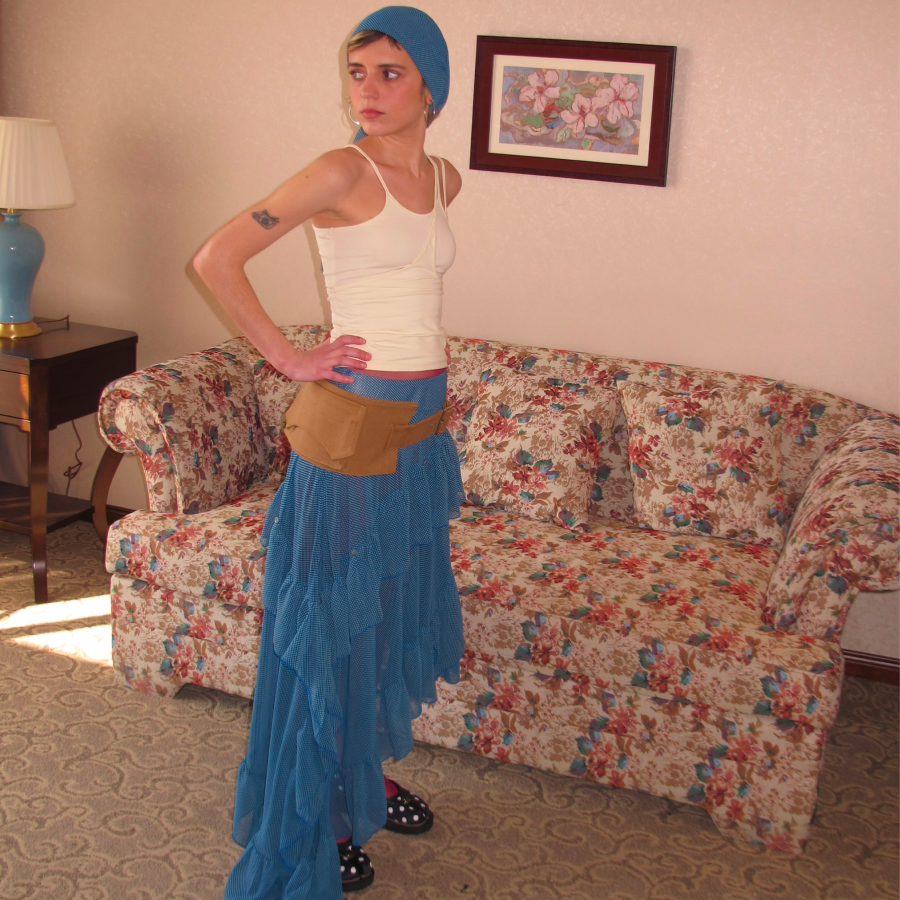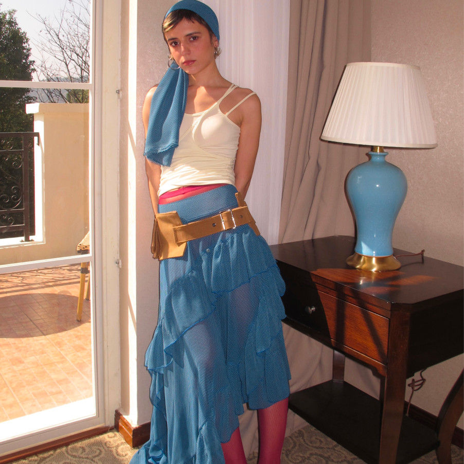 AXIS OF 弗拉明戈 复古蓝色不规则长裙子堆褶微透a字网纱半身裙