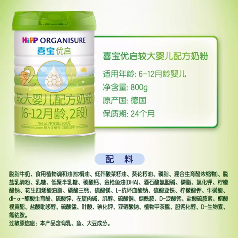 Hipp/喜宝优启有机婴儿配方德国进口牛奶粉2段(6-12月)800gx3罐