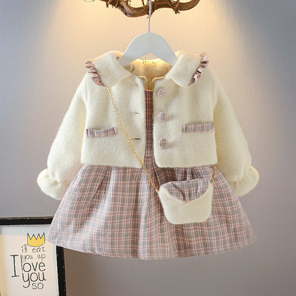 童装女童秋冬格子连衣裙婴儿裙子宝宝水貂绒外套背心马甲裙两件套