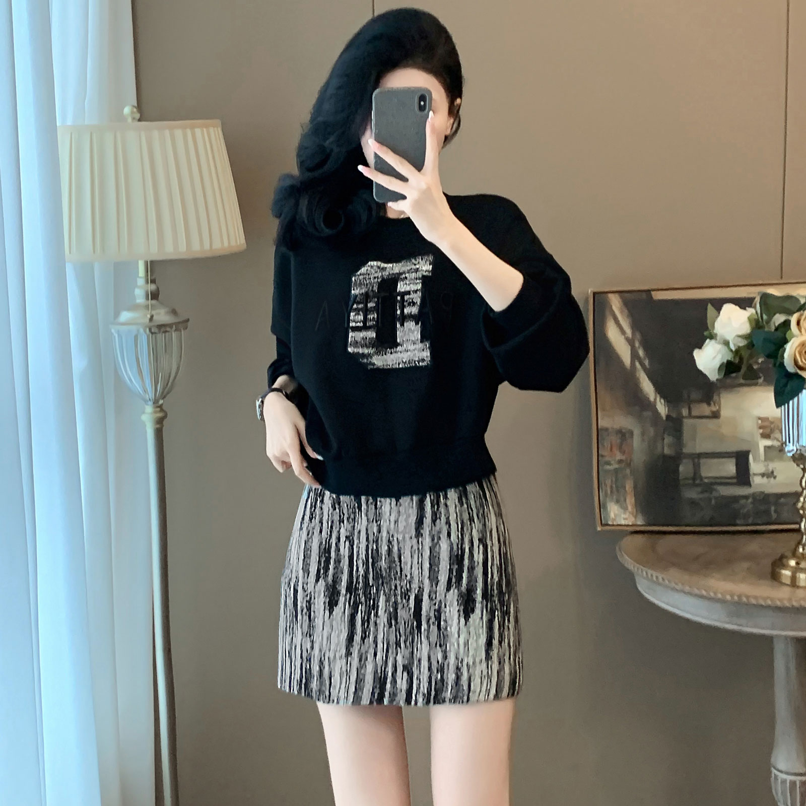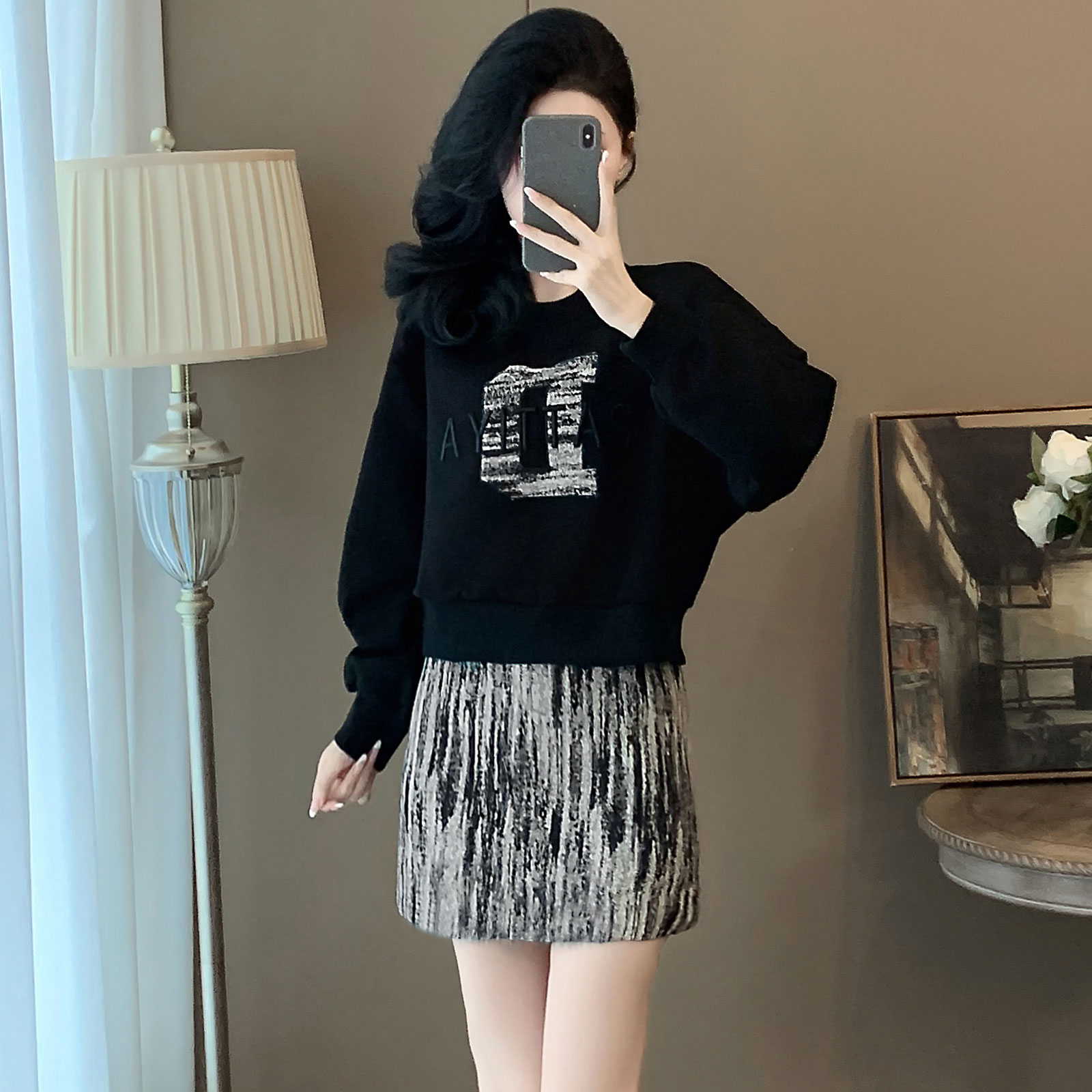 迪奥25春秋新款时尚套装裙女气质休闲卫衣印花半身裙高级感两件套