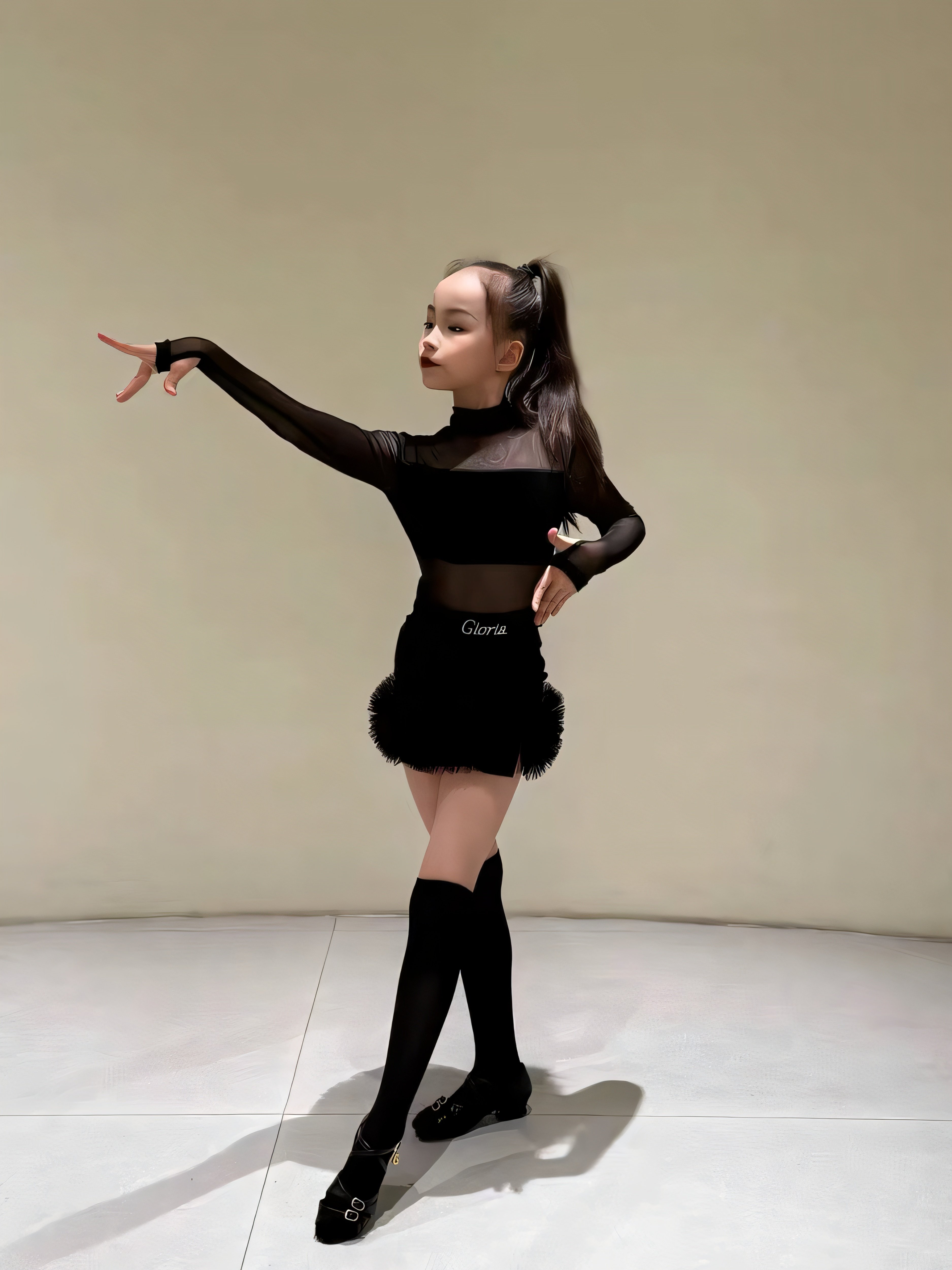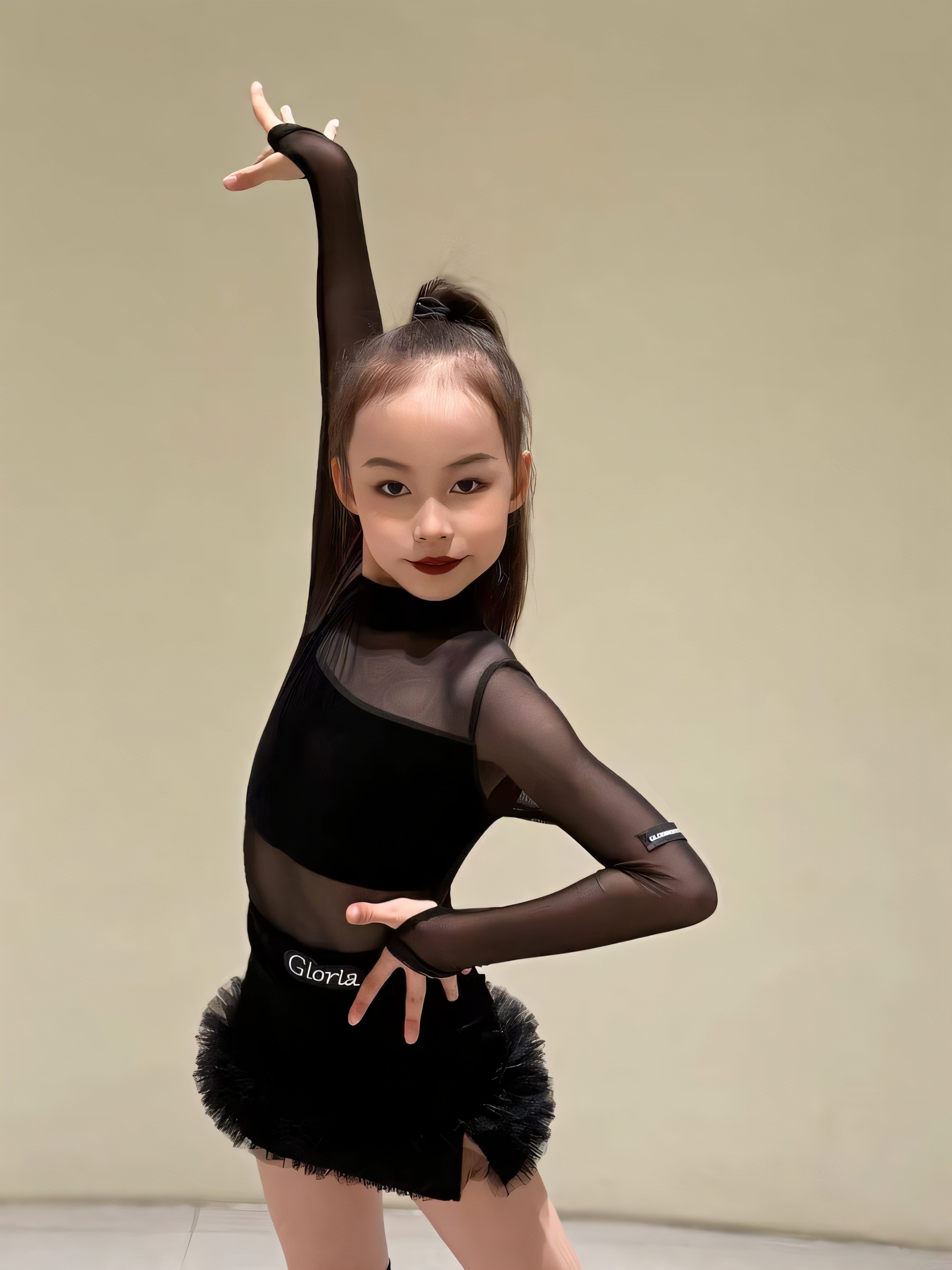 歌瑞亚拉丁舞服女儿童新款网纱袖上衣包臀半裙套装表演出练习功服