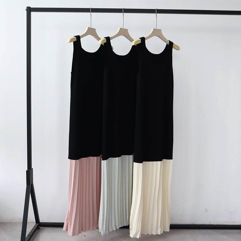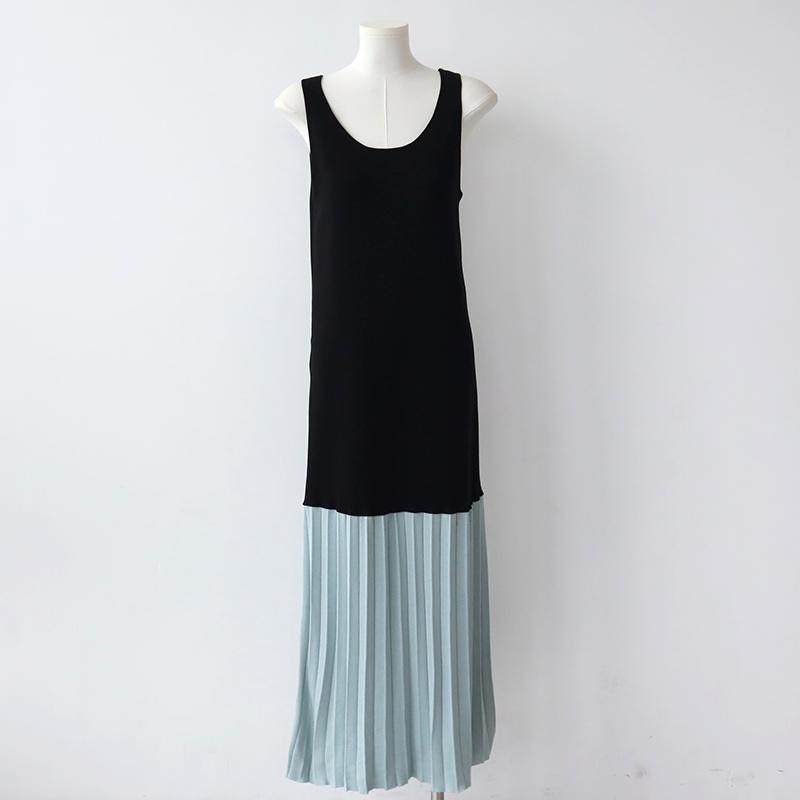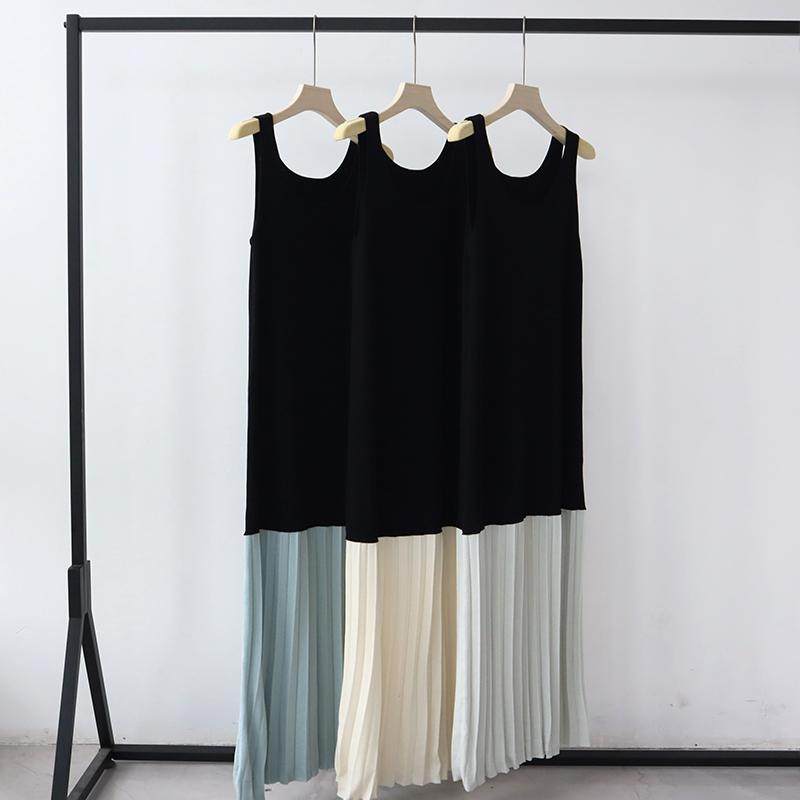 春夏新款女装莱赛尔天丝针织吊带背心连衣裙设计感拼接气质百褶裙