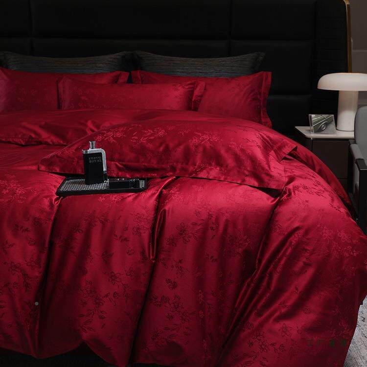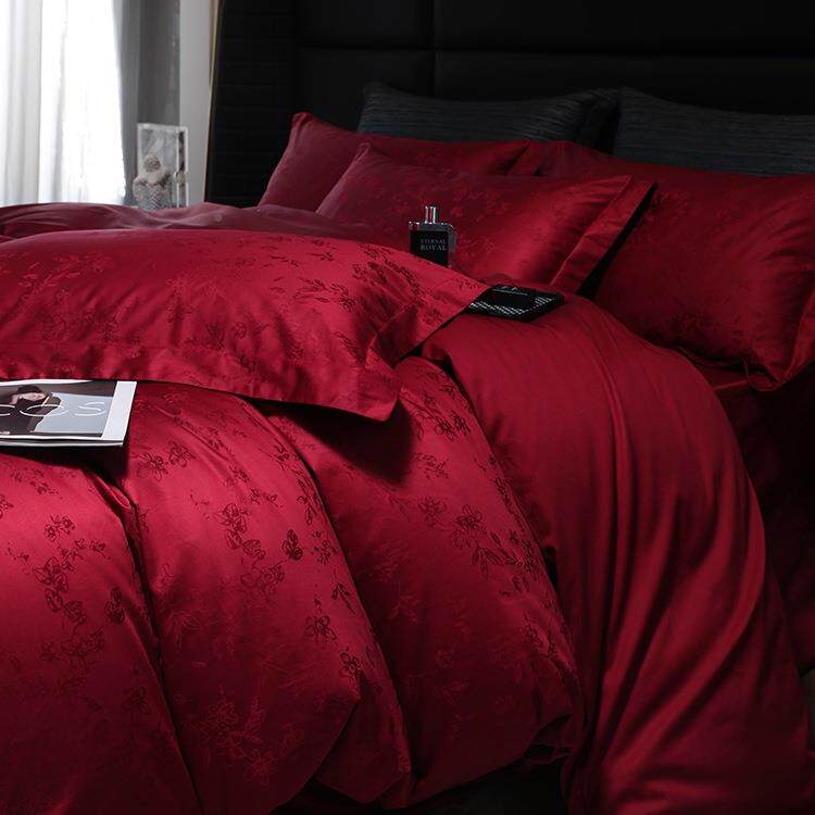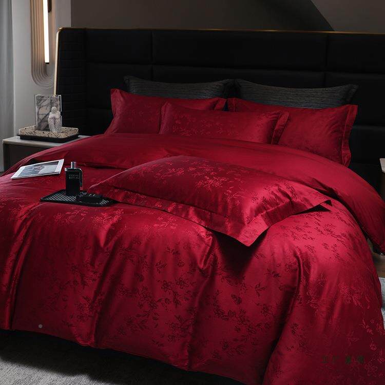 轻奢风婚庆四套10S长0绒F5M8TS95棉提花件被套酒红色床棉质床单结