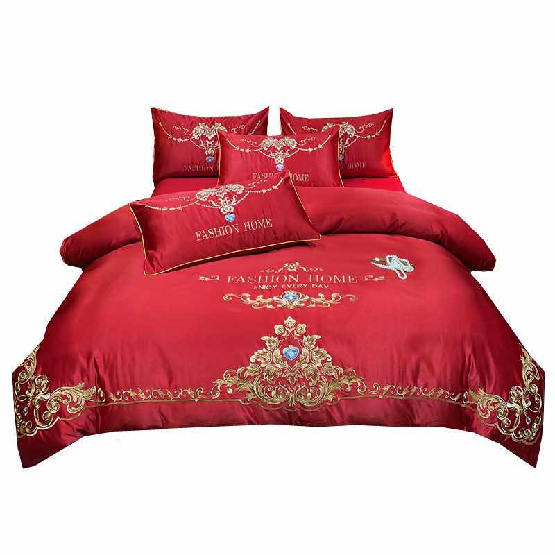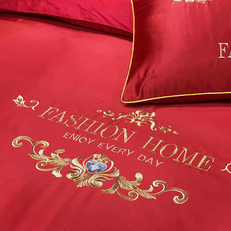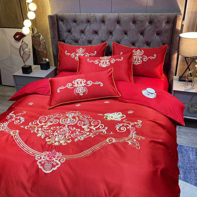 高档高档欧式结婚床上用品婚庆四件组大红色床单刺绣被套婚嫁喜被