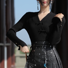 秋冬国风针织衫搭配马面裙上衣盘扣V领黑色新中式修身打底衫套头¥ 600