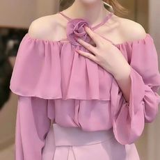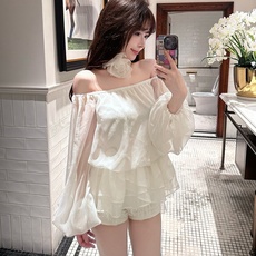 AZure温柔风雪纺衫一字领可露肩上衣荷叶边蕾丝裙裤套装宽松显瘦