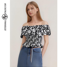 EF法式优雅气质显瘦短上衣2025夏季新款荷叶边一字领碎花雪纺衫