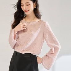 粉色甜美女剪花雪纺衫上衣秋新22655一字领短流苏25衬衫