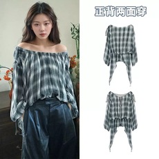 [现货]金靖同款一字领系带飘带上衣格纹长袖收腰雪纺印花