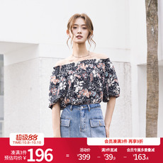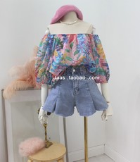 碎花雪纺衫荷叶边下摆收腰百搭泡泡袖性感一字领露肩宽松上衣女夏