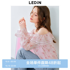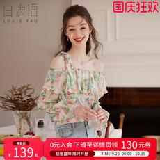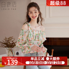 白鹿语荷叶边印花雪纺衬衫女长袖25春新浪漫不对称露肩一字领上衣