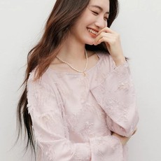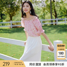 衣香丽影粉色一字领碎花雪纺衫女2025夏装新款重工打揽仿真丝上衣