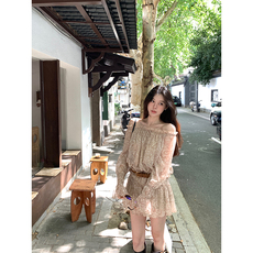 VASSE美蟹 度假感一字领印花雪纺松紧上衣女秋高腰短裙腰果花套装