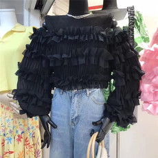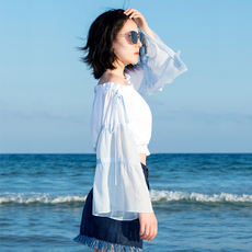 夏季休闲沙滩度假上衣一字领白雪纺长水袖高腰露脐露肩潮流超仙女