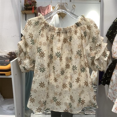 荷叶边一字领胖mm遮肚显瘦大码宽松短袖花色雪纺衫女夏装新款上衣