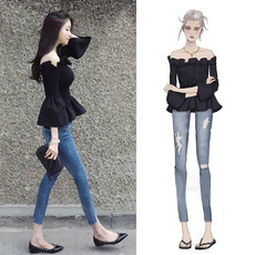黑色一字领雪纺荷叶露肩上衣性感体恤夏季修身显瘦纯棉t恤女短袖
