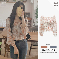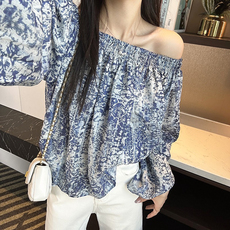 碎花雪纺衫长袖女衬衫气质高腰短款一字领露肩上衣