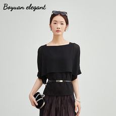 柏媛法式气质设计感雪纺衫女宽松显瘦披肩式假两件时尚一字领上衣