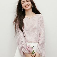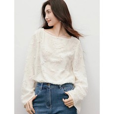 熙世界羽毛流苏一字领雪纺衫女2025秋季新款高级感喇叭袖宽松上衣