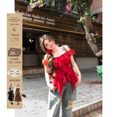 红色荷叶领一字肩V领雪纺衫衬衫上衣女2025夏新款高级感薄款小衫