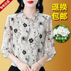 杭州高端大牌碎花真丝衬衫女七分袖桑蚕丝上衣夏季洋气木耳领小衫