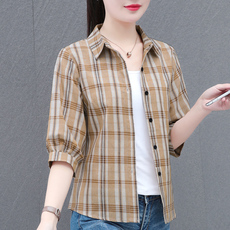 格子衬衫女士七分袖夏季新款妈妈装洋气衬衣中袖时尚显瘦棉质上衣