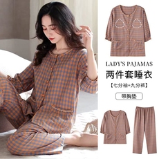 带胸垫纯棉睡衣女士春夏季七分袖九分裤空调服宽松大码家居服套装