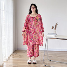 新中式棉绸薄款大码睡衣套装女胖MM200斤夏半袖七分裤国风家居服
