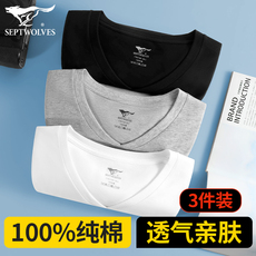 七匹狼纯棉短袖男士100%全棉T恤夏季薄款V领打底汗衫男夏天鸡心领